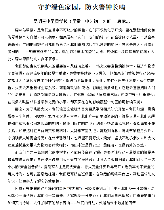 初一2班段承志 守护绿色家园,防火警钟长鸣作文.docx